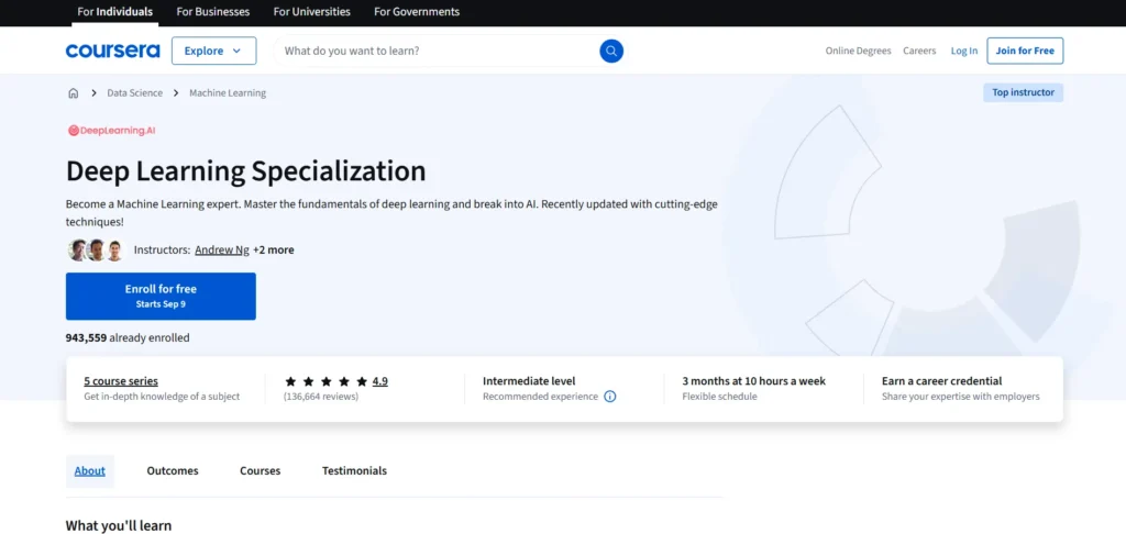 DeepLearning.AI Machine Learning SpecializationDeepLearning.AI3 months (4 hours/week)Intermediate4.9/5Learn machine learning techniques including supervised and unsupervised learning.
