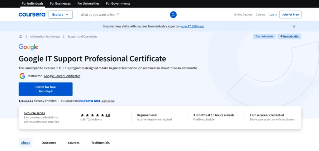 Google IT Support Professional CertificateGoogle6 months (5 hours/week)Beginner4.8/5A comprehensive introduction to IT support, including troubleshooting, customer service, and networking.