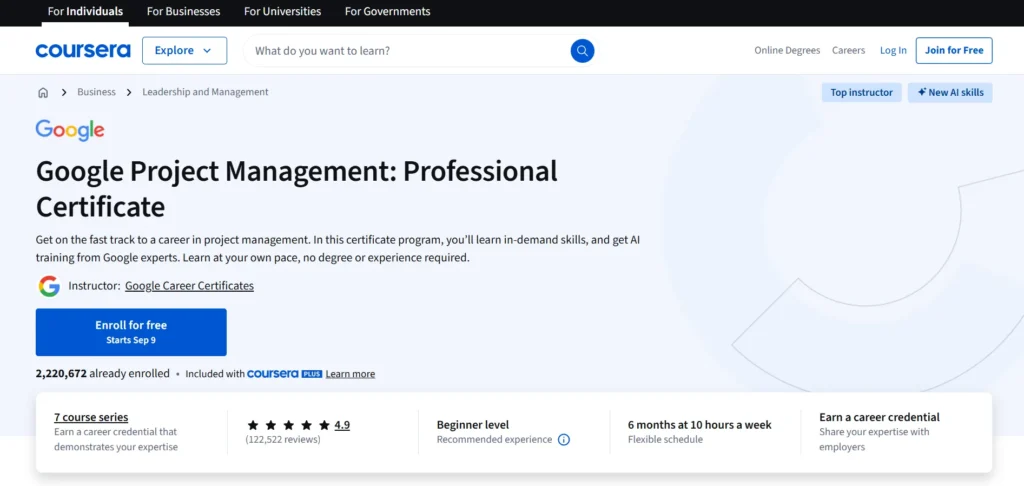 Google Project Management Professional CertificateGoogle6 months (5 hours/week)Beginner4.7/5Learn project management fundamentals, including Agile and Scrum methodologies.