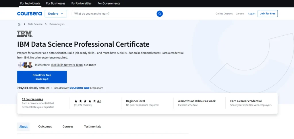 IBM Data Science Professional CertificateIBM3 months (5 hours/week)Beginner4.7/5Covers data analysis, visualization, and machine learning with Python.