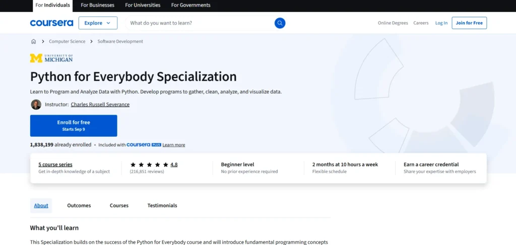Python for Everybody SpecializationUniversity of Michigan5 months (4 hours/week)Beginner4.9/5Introduction to programming using Python and learning data structures, databases, and web scraping.