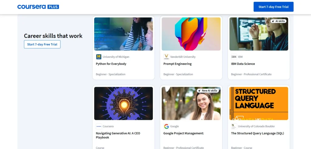 Coursera offers a very wide variety: data science, AI, computer science, business, health, humanities, languages, arts, and more. Because it partners not just with universities but with industry players (Google, IBM, Meta, etc.), many courses or certificates aim to align closely with employer needs.