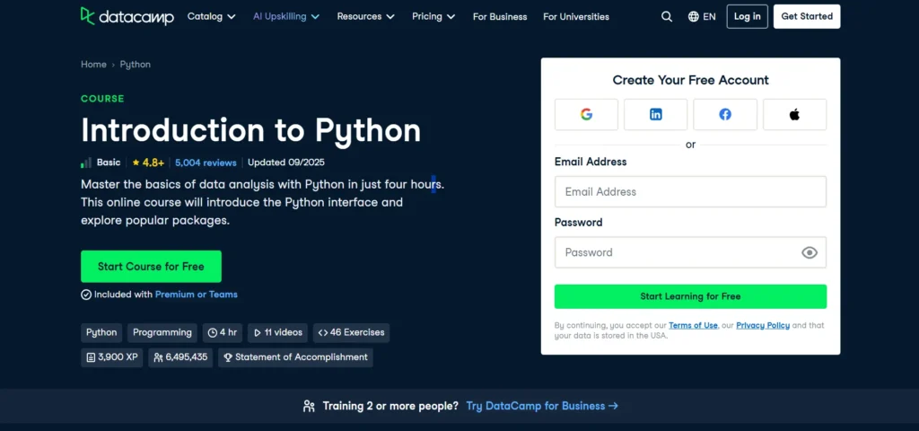 For organizations, DataCamp offers team and enterprise plans with custom pricing.
