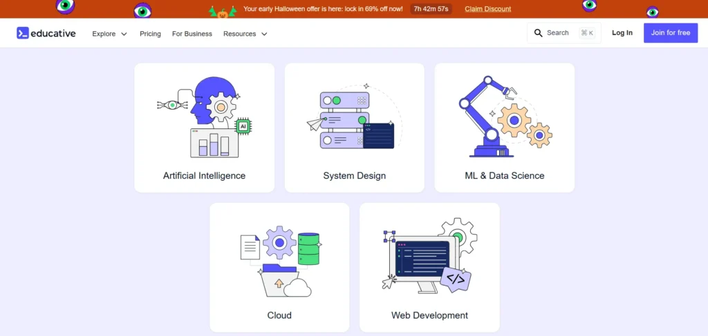 • Interview Preparation: Educative is particularly known for its interview preparation courses. These cover everything from basic coding questions to advanced system design problems, which are crucial for those looking to land a tech job.