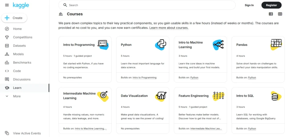 Another major highlight is Kaggle Learn, which provides free, short, and practical courses covering topics such as Python, machine learning, and data visualization. It’s an easy way to practice coding and build applied skills.