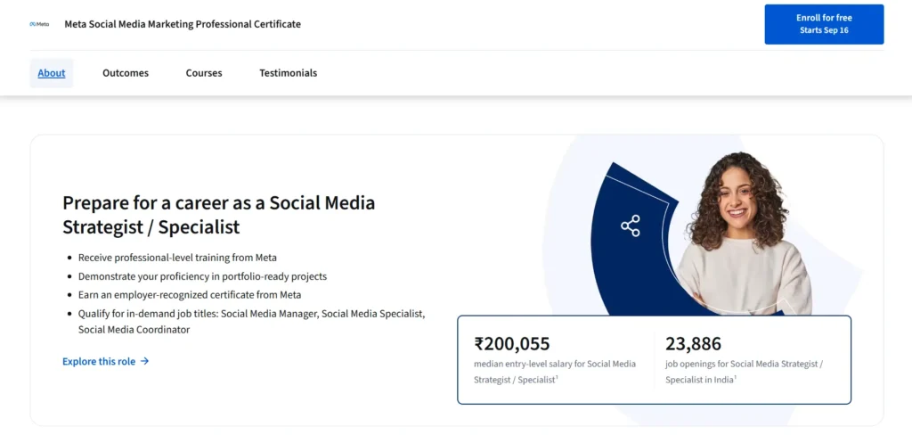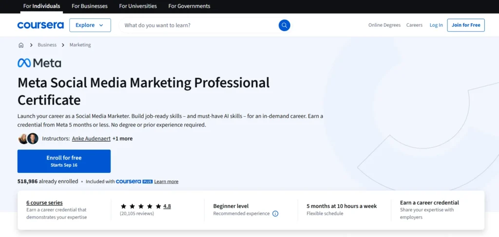 On Coursera, this certificate is shown as “beginner friendly” and positions itself as offering a clear path into social media roles with measurable skills.