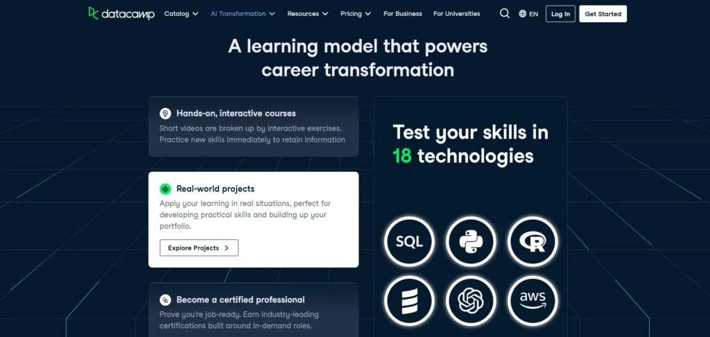 With its browser-based coding environment, DataCamp allows learners to immediately apply what they’ve learned and receive instant feedback on their progress. This real-time interaction helps solidify coding concepts and offers a more engaging way to learn complex topics.