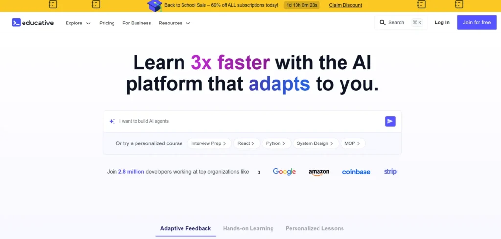 Educative’s interactive, text-based approach provides a more immersive learning experience. The built-in coding environments allow learners to practice as they learn, reinforcing concepts through immediate application. This hands-on method is particularly beneficial for those looking to develop practical skills in programming and software development.