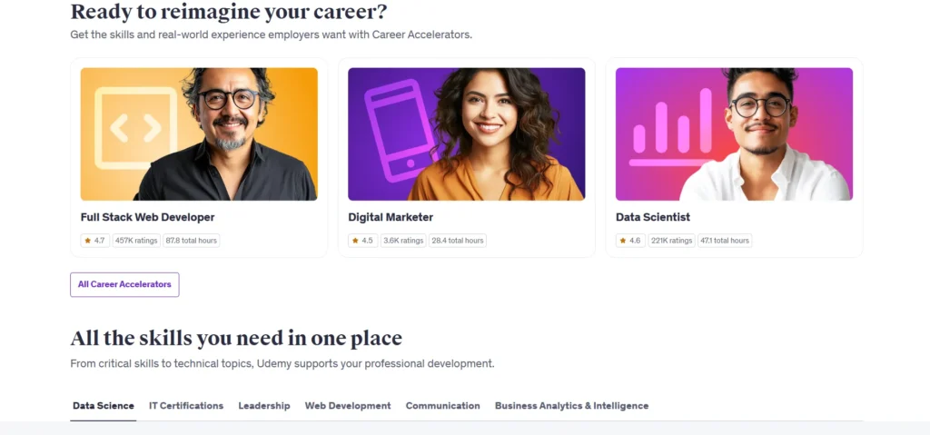 Upon completing a course, learners receive a certificate of completion, which can be added to resumes or LinkedIn profiles. However, these certificates are not accredited and may not carry significant weight with employers. Udemy also offers a range of career-focused courses, but the platform lacks personalized career support services.