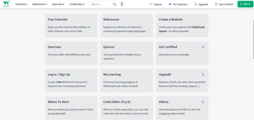 To understand what W3Schools offers, let me walk you through its main features. These are the things you’ll actually use (or struggle with) when learning via this platform.