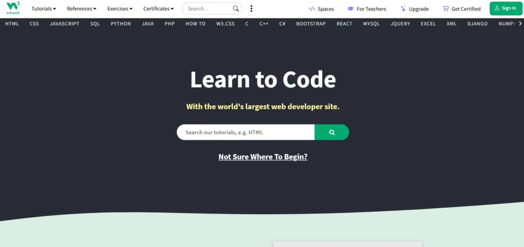 Because it touches many areas under one roof, W3Schools allows you to experiment across front-end, backend, databases, APIs, etc., without switching platforms early.